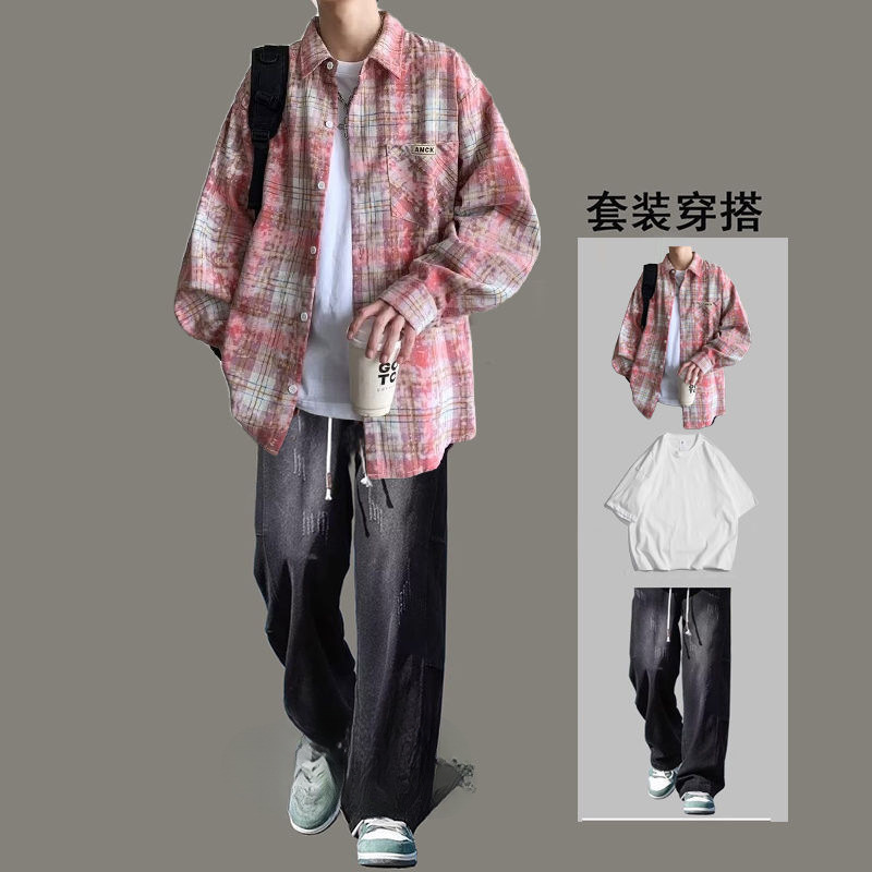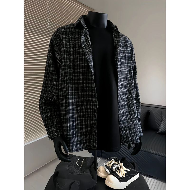 レトロ衝突色格子シャツ男性長袖上着早春感チェックシャツ