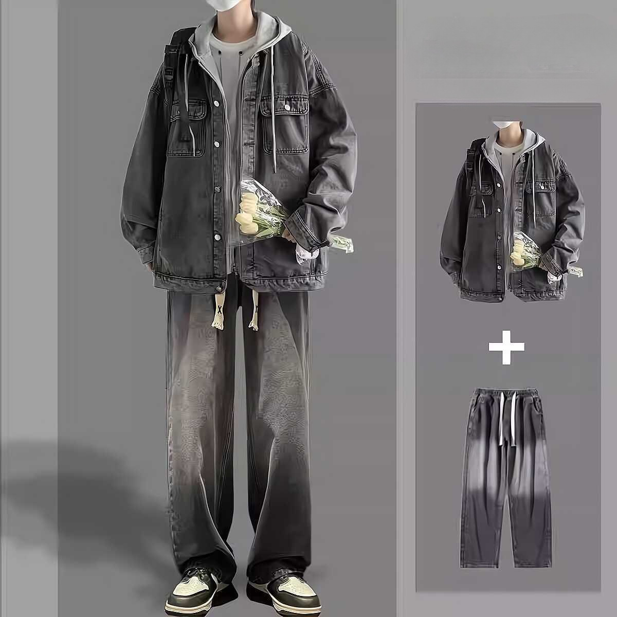 春と秋のファッション偽の2つの帽子付きのデニムのコートの男性のファッションのブランドのかっこいい青少年のジャケットのスーツのセットの組み合わせ