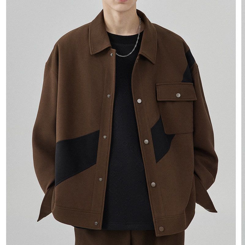 色にぶつかってデザイン感をつなぎ合わせて襟を折ります。ジャケットはゆったりしています。