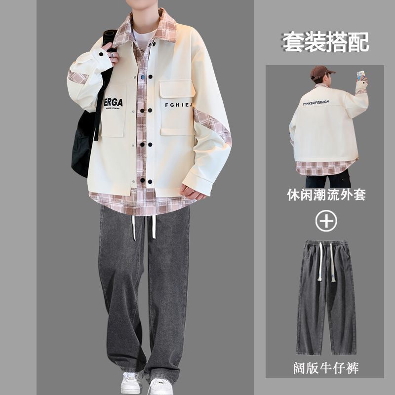 偽の2つのコートの男性春秋のシャツ式のジャケットの男性の潮のブランドの格子は上着の青少年の香港風のスーツをつなぎ合わせます。