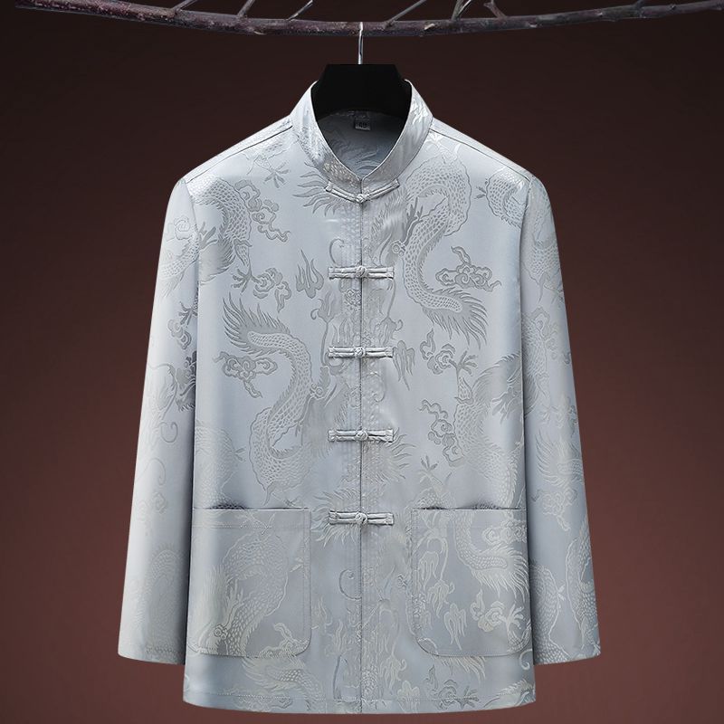 新中国式唐装男中高齢者春夏氷糸レトロ長袖盤龍紋おじいさん装漢服太極服