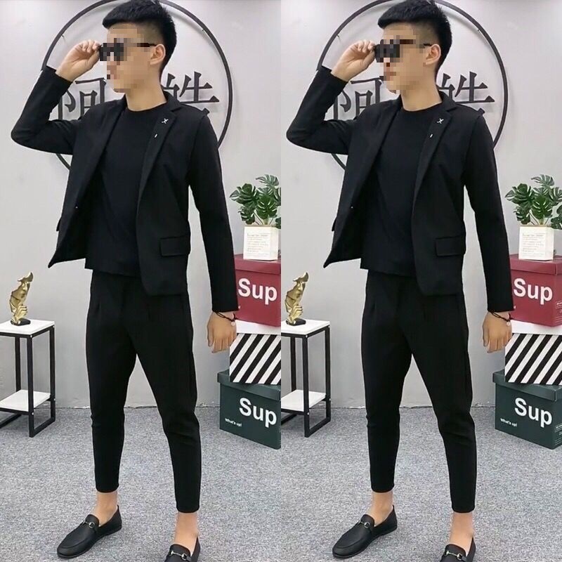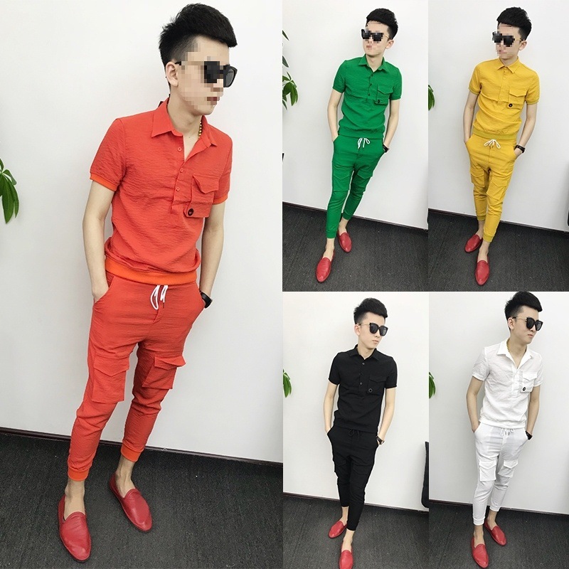 夏の男性ファッション韓国版カジュアルスーツ社会グループ半袖tシャツ2点セット