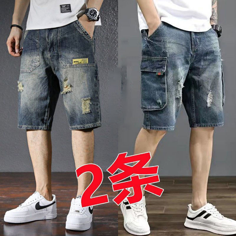 マルチポケットルーズデニムショートパンツメンズショートパンツプラスサイズリッピングクォーターパンツレトロジーンズオーバーオールズボン