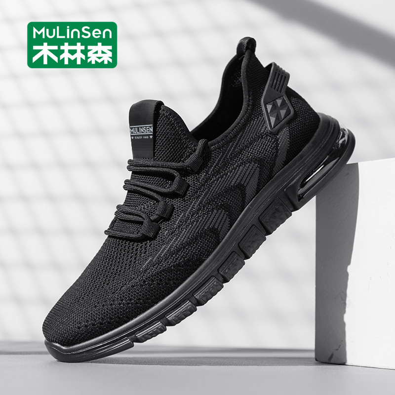 木林森男靴夏通気黒飛織ネット靴男性軽量ソフト底カジュアルランニングスポーツシューズ