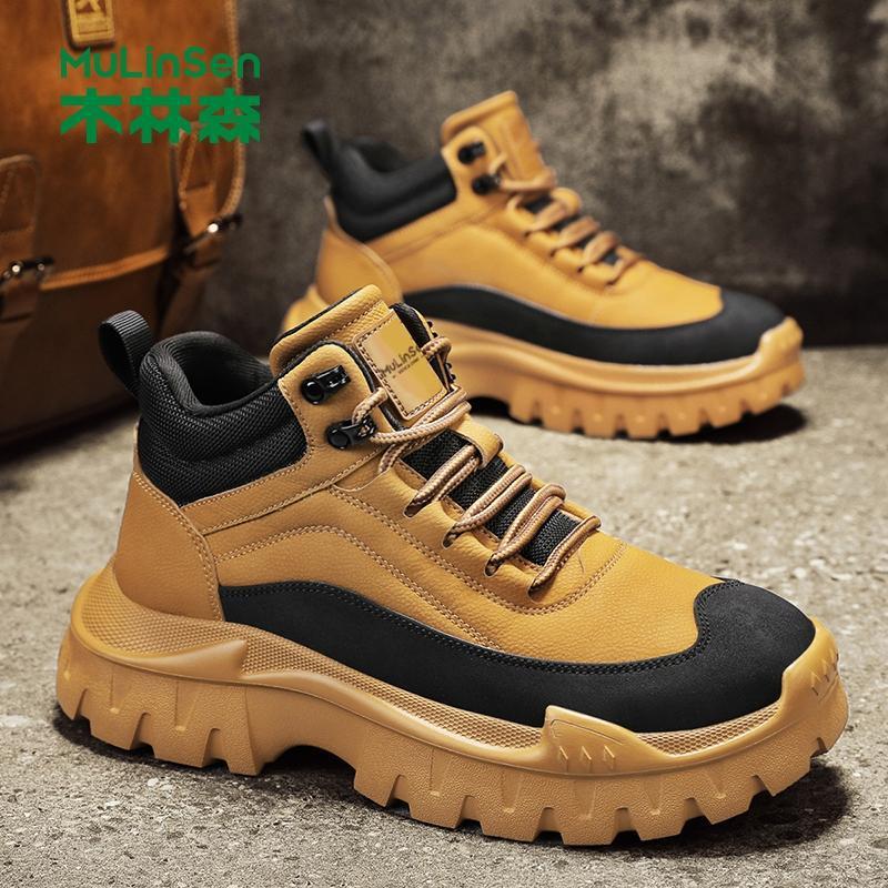 木林森高組ブーツ男冬戸外雪地靴男金厚い底大黄靴ベルベット保温工装男靴