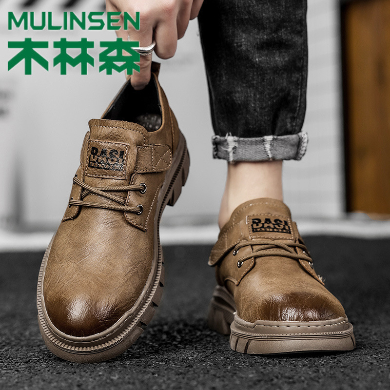 木林森カジュアル革靴男性金2024新型軟面真皮男性靴復古英倫工装低助マーティン靴