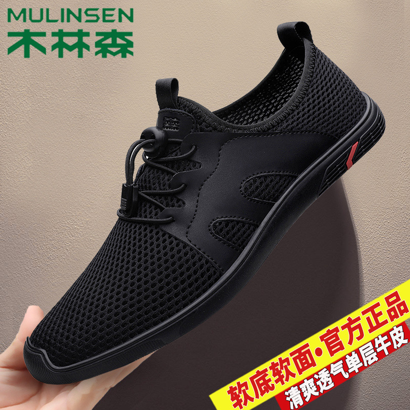 木林森男靴夏の通気性ビジネスカジュアル靴柔らかい皮の柔らかい底に真皮秋の新しい黒色の靴がついている