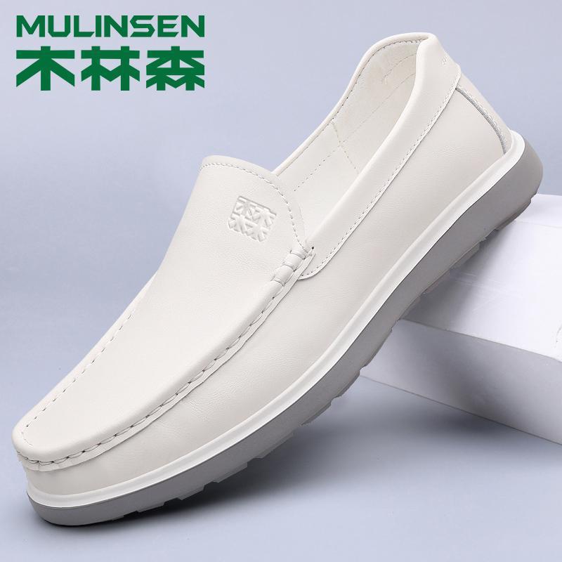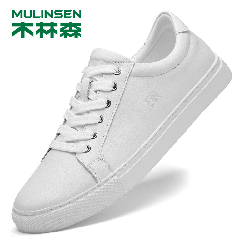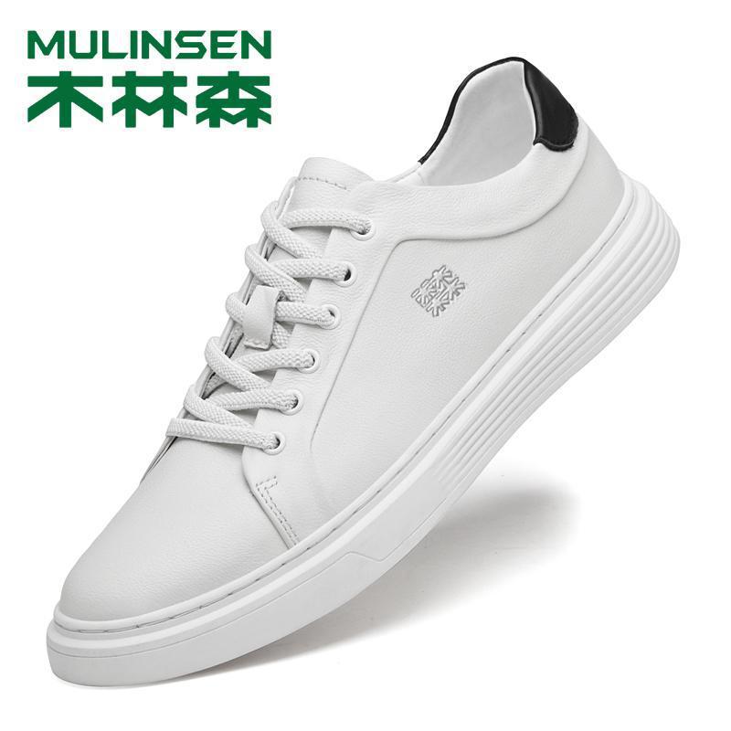 木林森男靴夏通気レジャー靴2024新型白色革靴男型真皮運動白靴