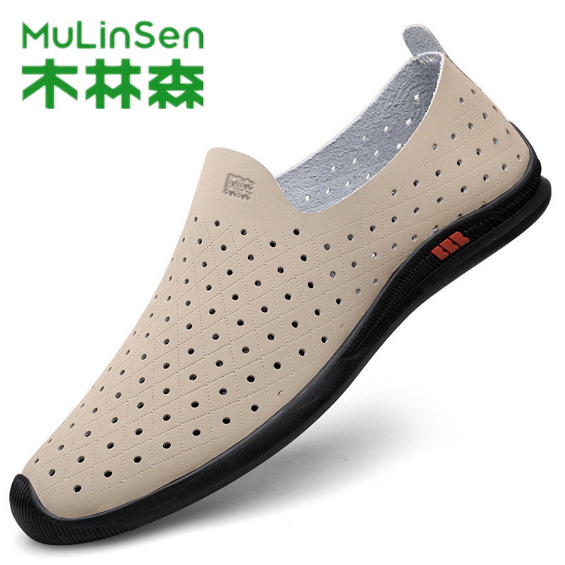 木林森男靴夏の薄い軽量男性カジュアル靴本革英倫軟底透かし透け通気穴靴