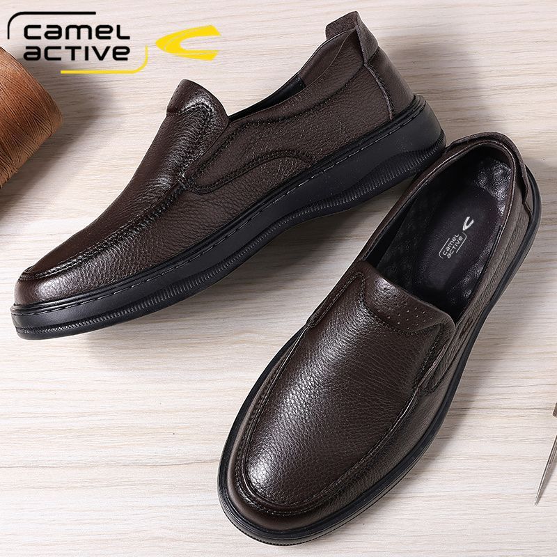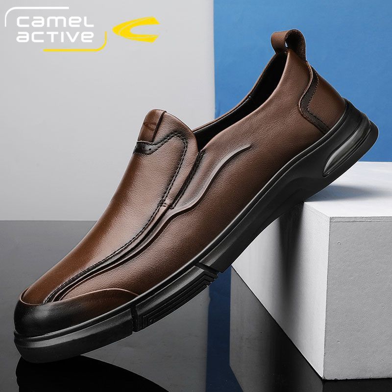 ラクダのダイナミックな男性の靴の本革はビジネスカジュアルな靴の男性の足をかぶせて柔らかい底の快適な中高年のお父さんの靴を漕ぎます。