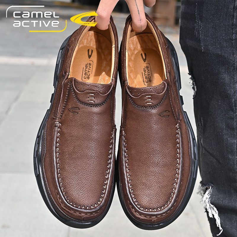 ラクダのダイナミックなビジネスカジュアル靴の男性の厚い底の足は怠け者の靴の男性の本革の柔らかい底の中年のお父さんの靴を踏んでいます。