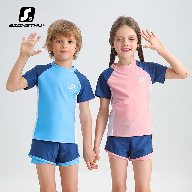ブランド子供スプリット学生水着男の子女の子中大きい子供半袖ショーツ水着速干保守水着