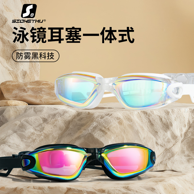 高級男女平光シリコン防水防霧成人水泳鏡大枠連体耳栓水泳鏡装備9100