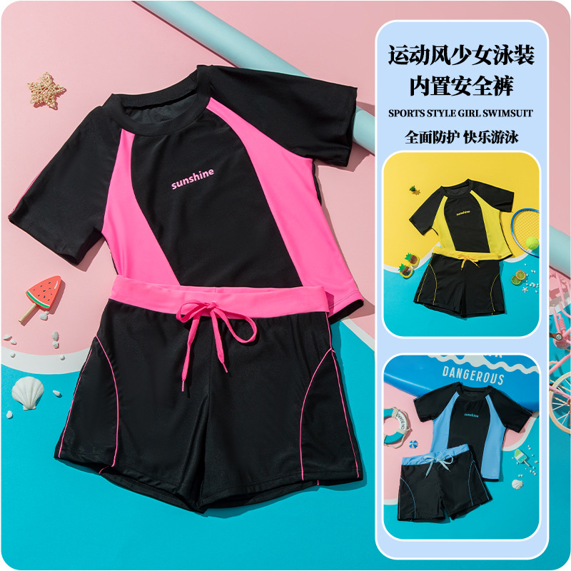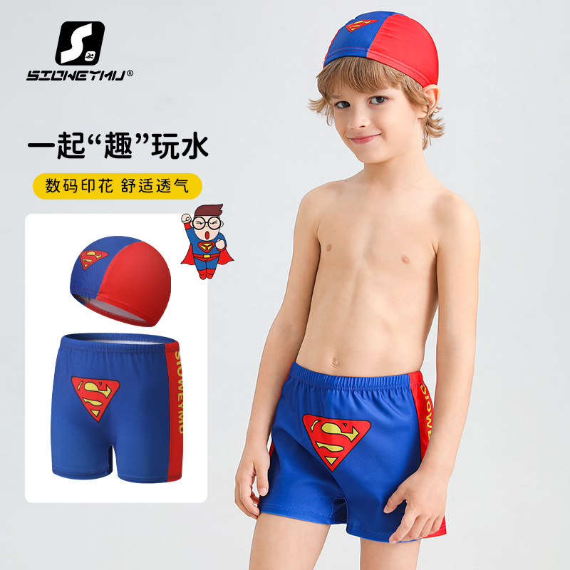 国境を越えた売れ筋の新しい子供用水泳パンツと水泳キャップのツーピースセット、男の子、中学生、ティーンエイジャー向けのスプリット水泳用品セット