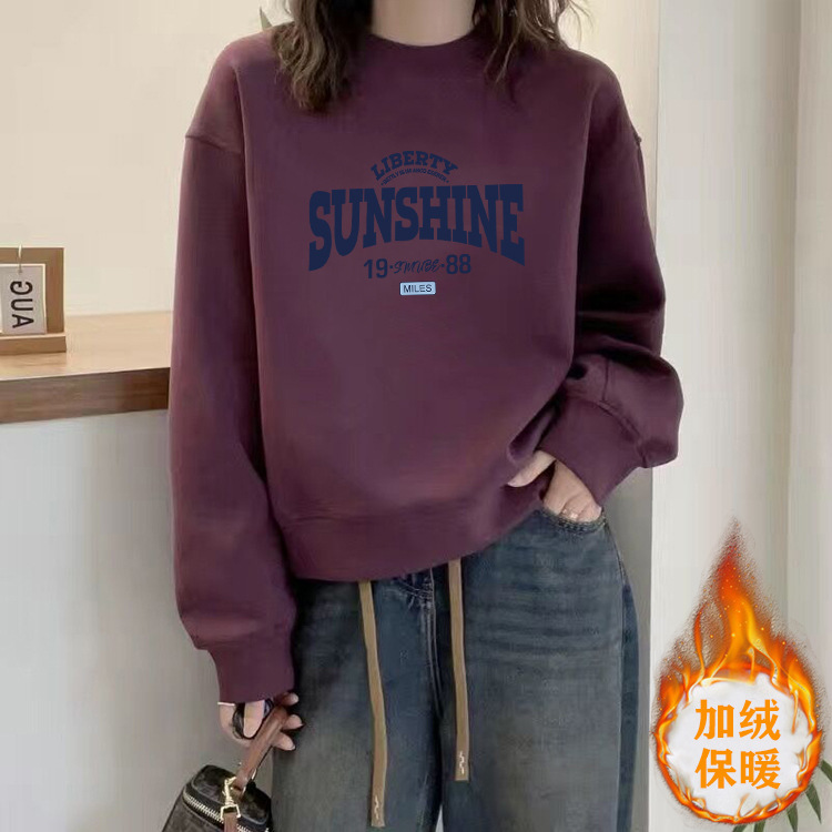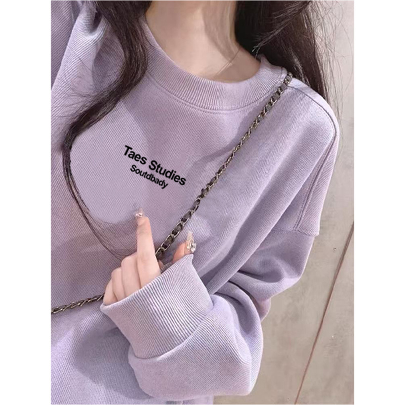 綿の丸首の薄い紫色の衛衣の女性の帽子がない2025春と秋にベルベットが厚くてゆったりしています。