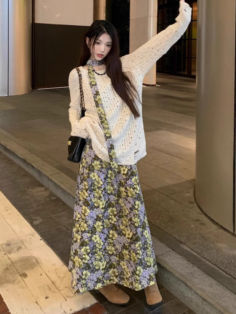 フランスの花のストラップのワンピースの子供は朝初めの春の雲南旅行はセットのロングスカートの2025の新型を着ます。