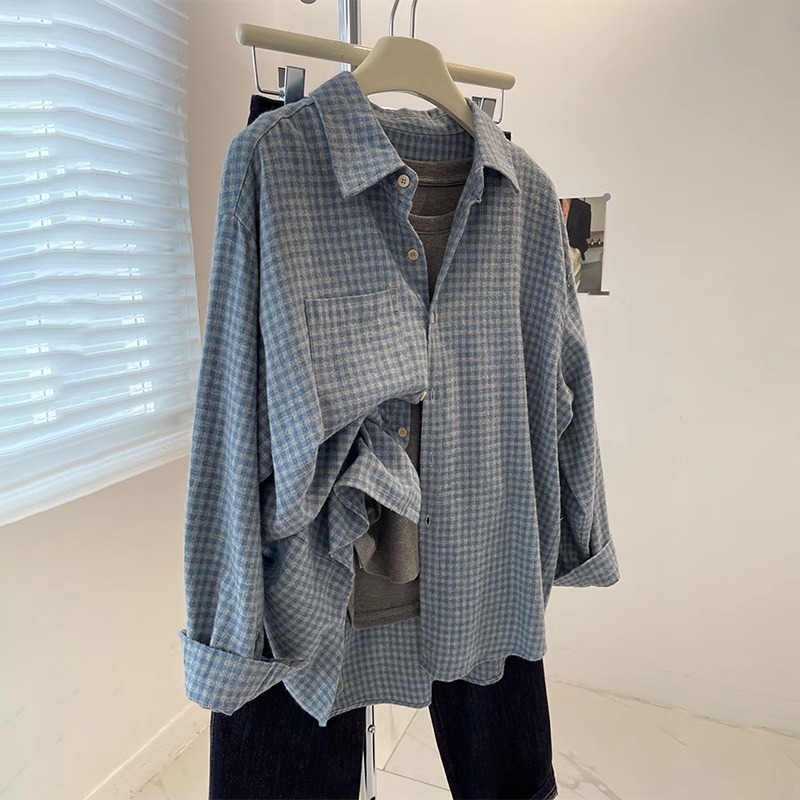 青い格子のシャツのコートの女性の上着の2025秋冬の新型の高級感のフランスの独特なシックなゆったりしたシャツ
