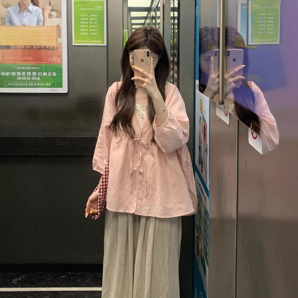 ピンクの純ラミー麻oversize日焼け止め長袖シャツ女装2025春のゆるいデザイン感ファッション上着