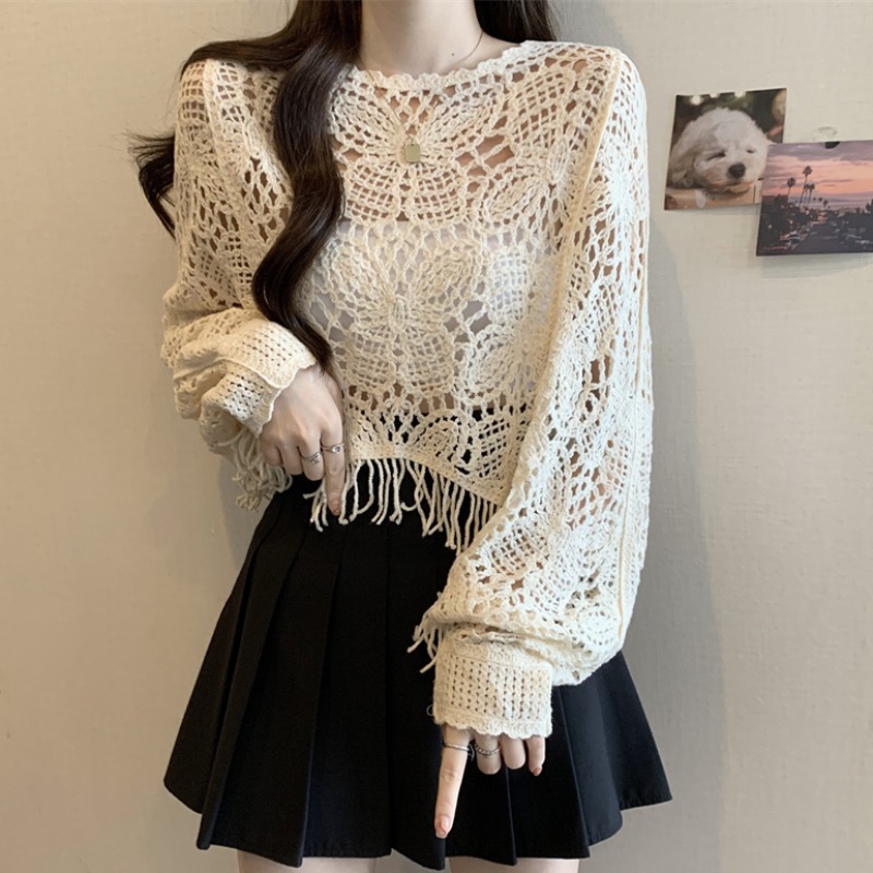 かぎ針の透かし彫りのニットの女性の春の服装の頭のフリンジの外でブラウスの小さい背の短い金のiu系の長袖の上着を掛けます。