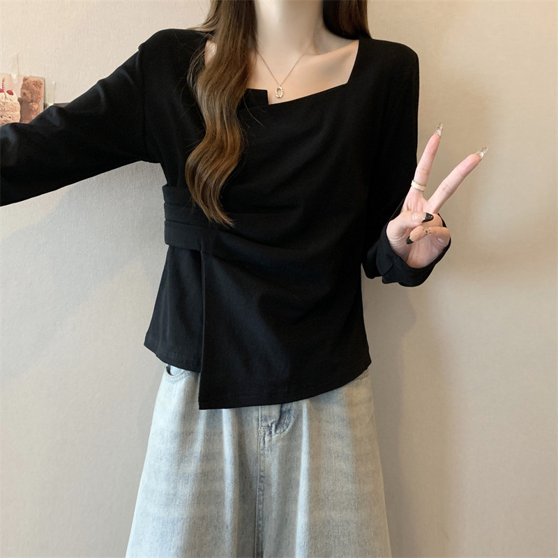 大きいサイズの黒色の不規則な長袖のtシャツの女性の春の太っているmmは腹を遮ってやせているショートタイプの肩の方の襟の中で上着を掛けます。