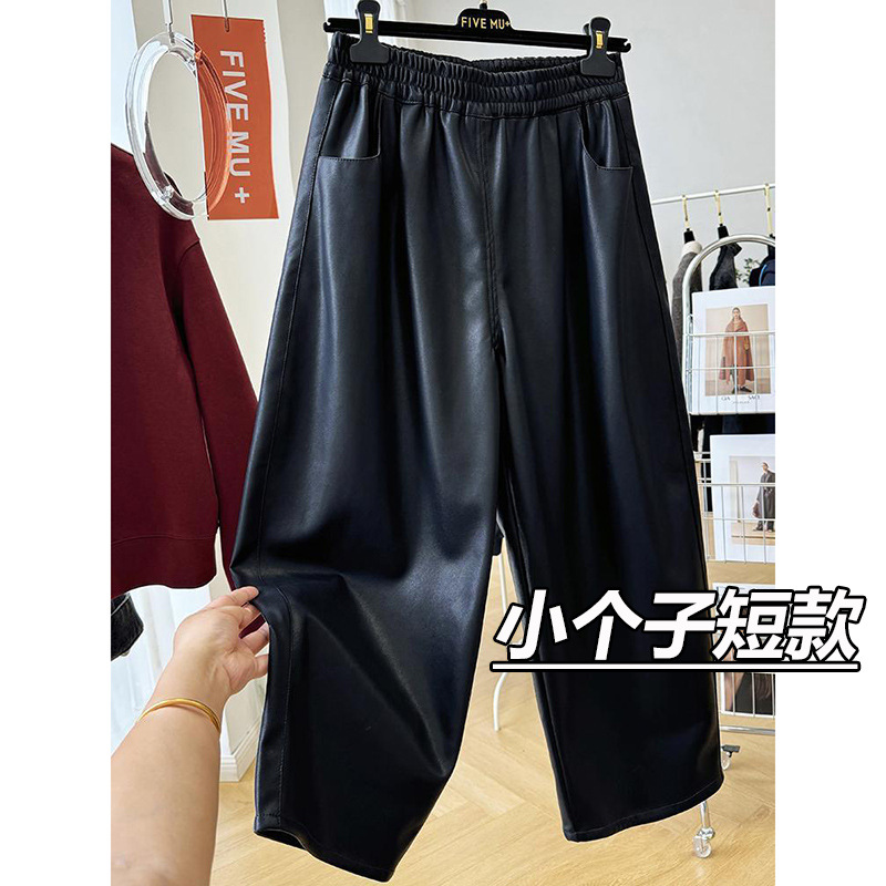 欧米の黒いpuの皮のズボンの女性の秋冬の新型の八分の広い足のカジュアルな小さい背の甘いクールな美人の緩めのダイコンのズボン