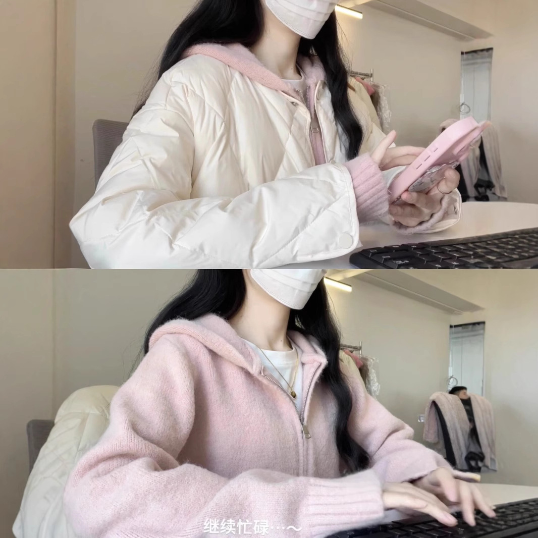 ピンクの帽子付きニットコートの女性は秋冬にゆったりしています。