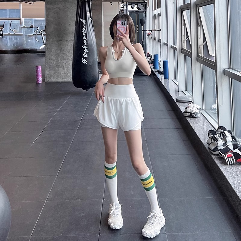 ポケット付きハイウエスト露出防止速乾ヨガスポーツショーツ女性用、ゆったりと通気性のある偽ツーピースランニングフィットネスパンツ薄手