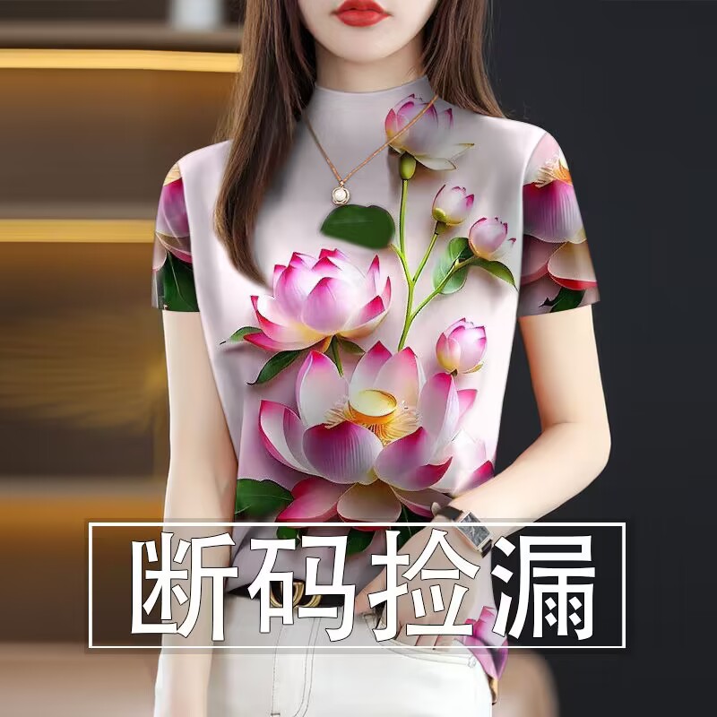 断号氷糸半高襟tシャツ底シャツ女2024夏の新型ファッション百合半袖上着