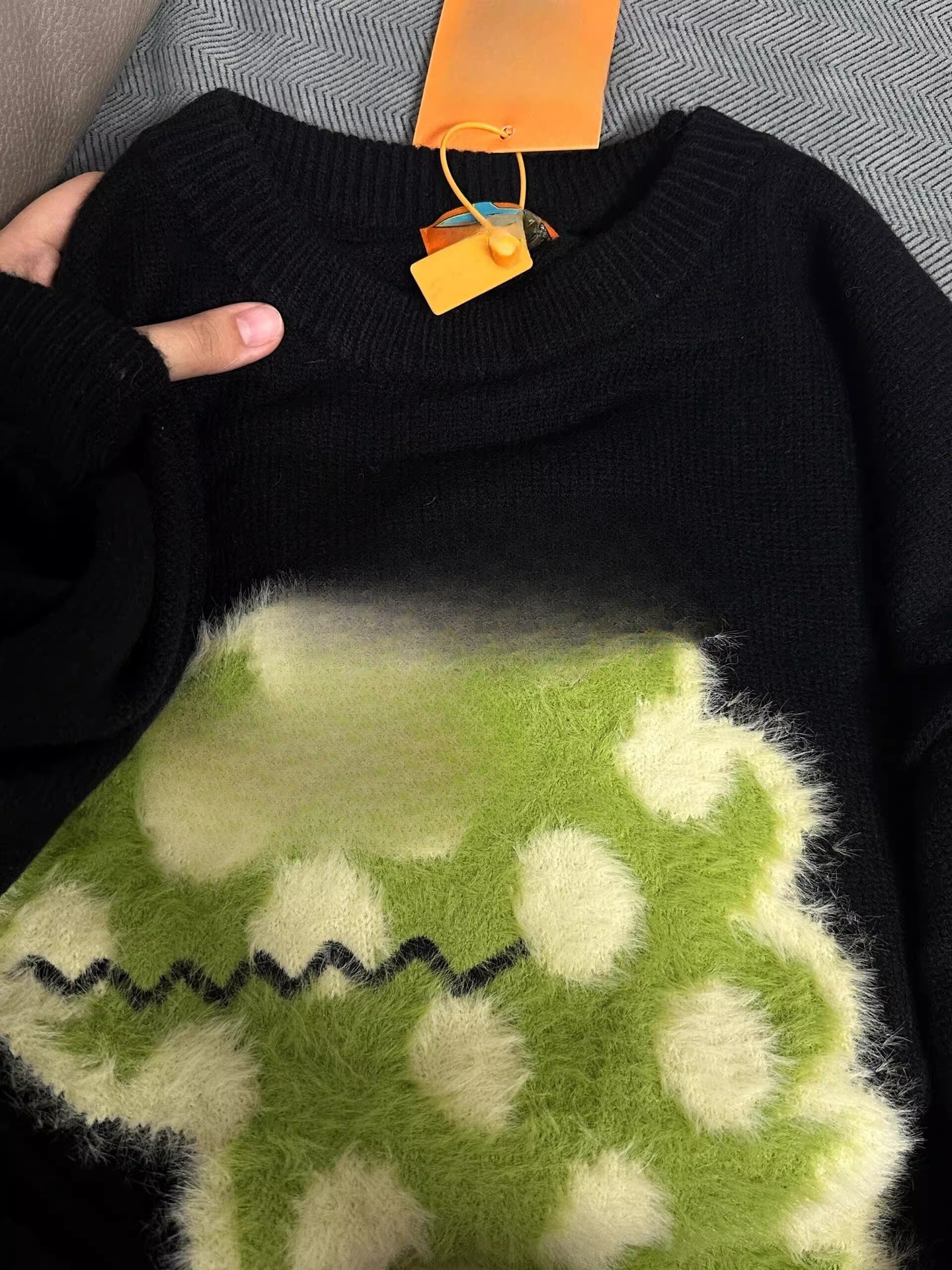日本の小衆のレトロで可愛い恐竜のセーターの女性はゆったりとしています。
