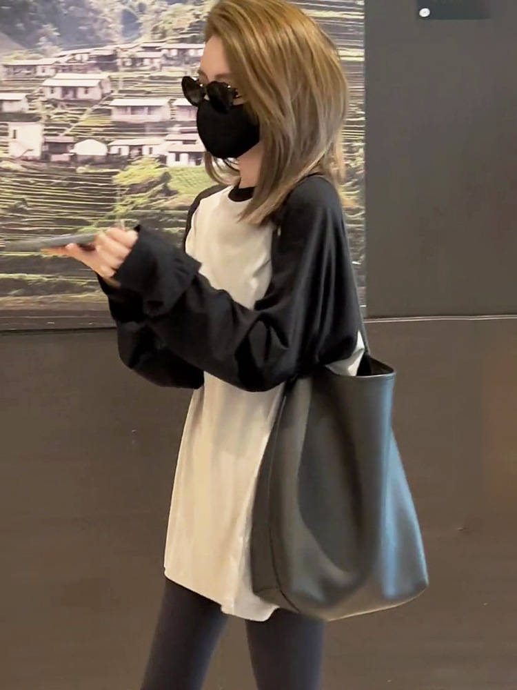 学院風は偽の2つのニットの女性春秋2023の新型のゆったりした短い長袖のセーターのカーディガンの上着をつなぎ合わせます。