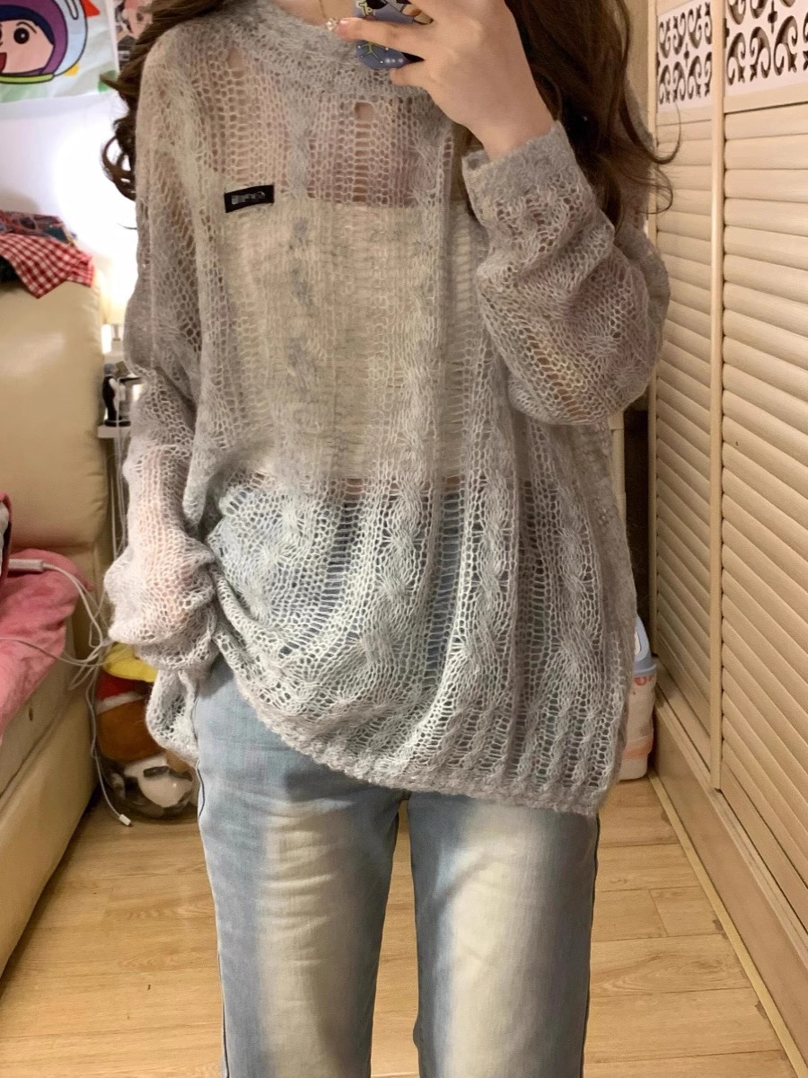 2024夏の薄いタイプの怠惰な風の日焼け止めの透かし彫りのブラウスの女性のゆったりとした外は薄い糸の穴のアメリカのニットの上着を掛けます。