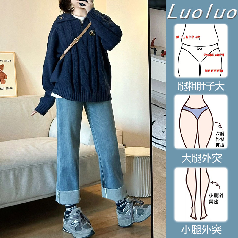 縁を巻いてまっすぐなジーパンの女性の秋の新型の大きいサイズは太っています。