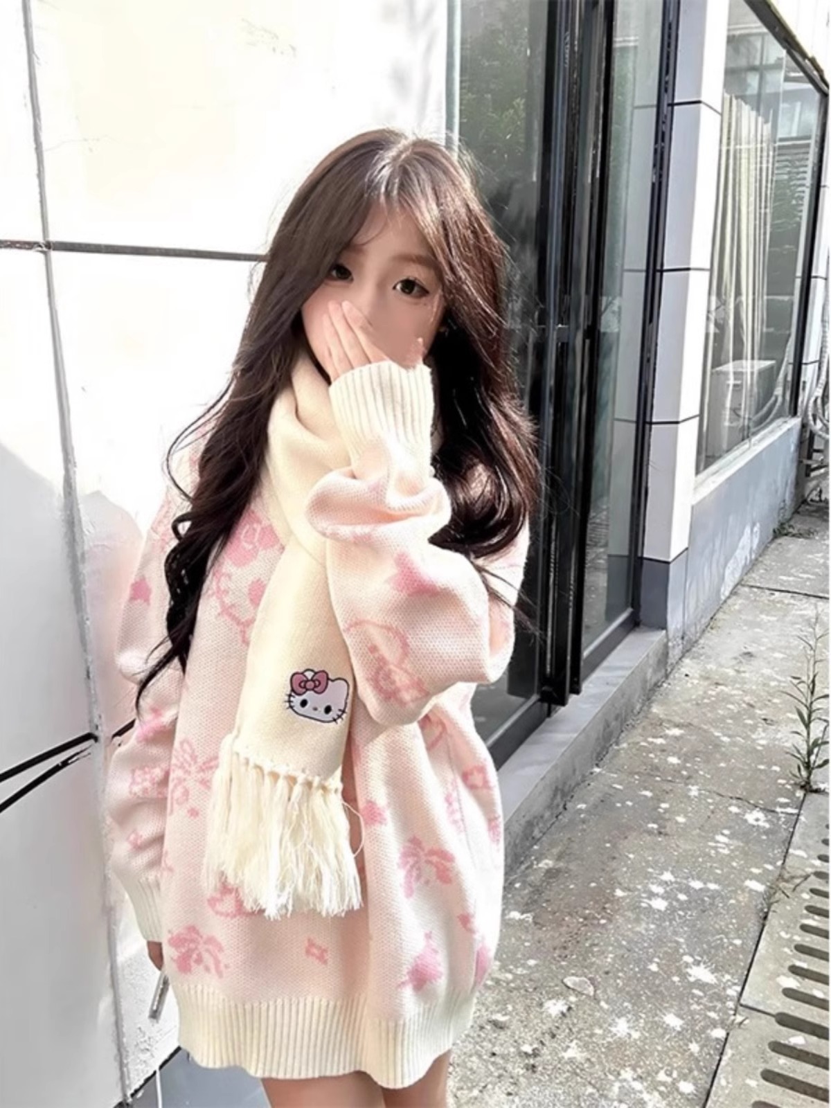 2024新型日系復古ケイティ猫セーター女性秋冬ゆるい高級感怠惰な風柔らかいモチモチのニット上着