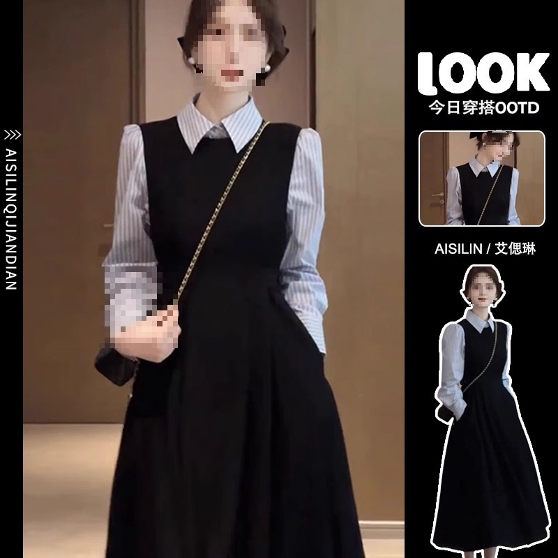 高級感のある黒いシャツのストラップのワンピースの子供の朝と秋の2024の新型の気質の小さい子供のスーツのロングスカート
