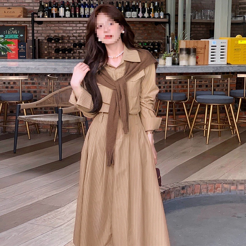 2024新作の早い秋のストライプの長袖のシャツのワンピースの子供の高級感は小さい背の気質の長いスカートに乗ります。