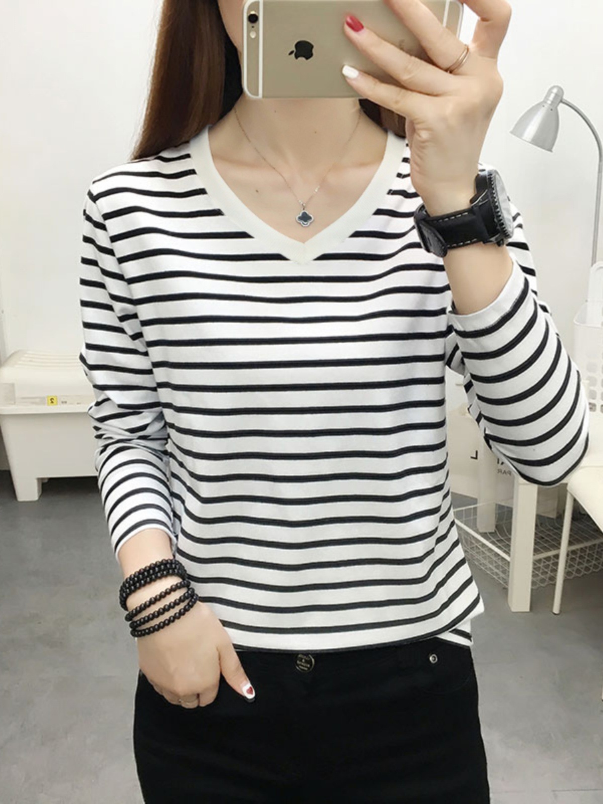 ストライプの長袖のtシャツの女性の綿のvネックの底のシャツの春秋の新型のゆったりしている大きいサイズの洋気のお母さんは上着を着ます。