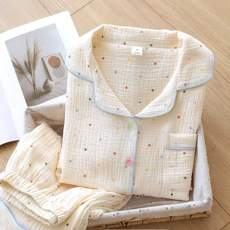 カラーの点の綿のガーゼのパジャマの女性のタイプの春秋の夏の長袖の綿の薄いタイプの家庭服のスーツは外で着ることができます。
