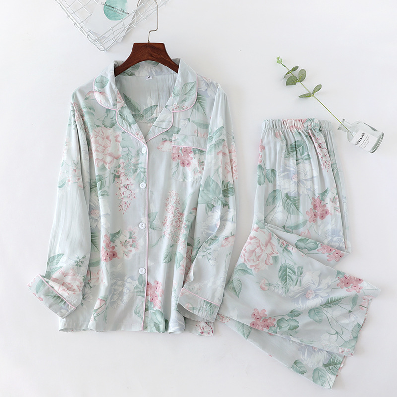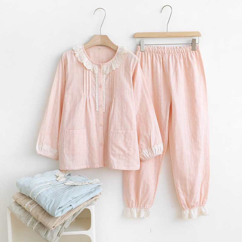 パジャマ女2024新春と秋の夏の綿ガーゼの家の服の長袖の薄いタイプの2つのセットは綿のレースを詰めます。