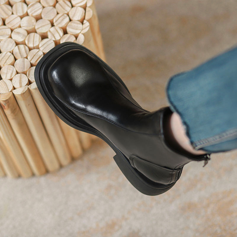 本革の厚い底のマーティンの靴の女性の2024新型の春と秋の方頭のやせている靴の単靴の黒色のチェルシーのショートブーツ