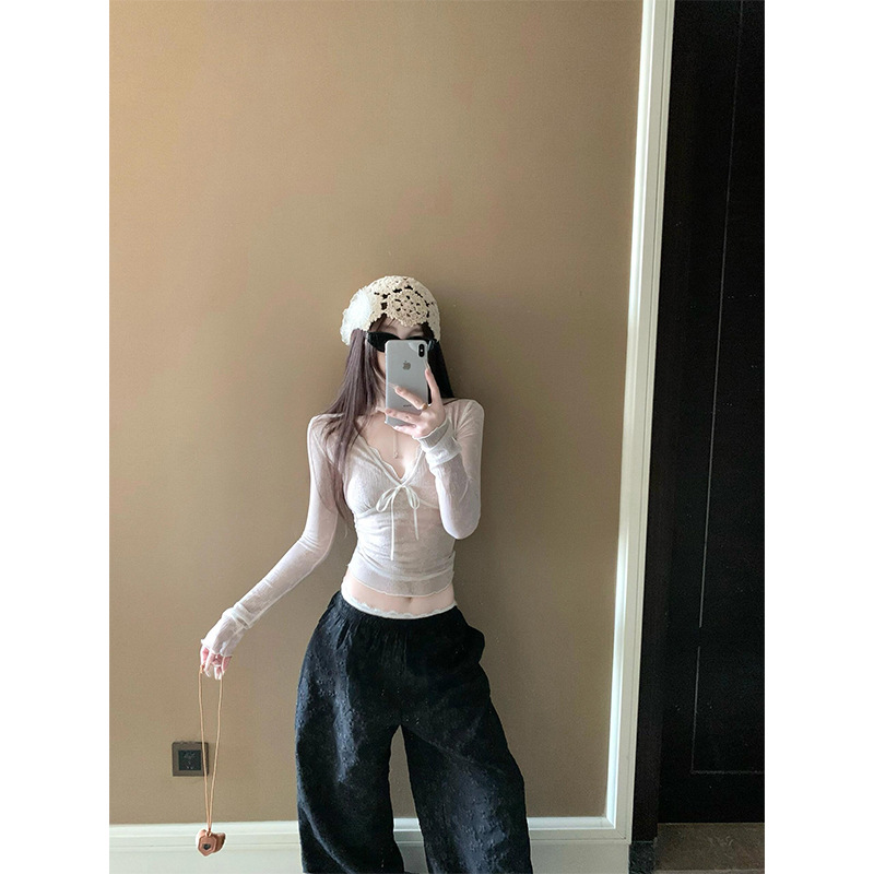 純粋な欲望風の甘いセクシーなvネック長袖tシャツの女性の早秋2024の新型は腰を収めてやせている小衆レースの上着を現します。