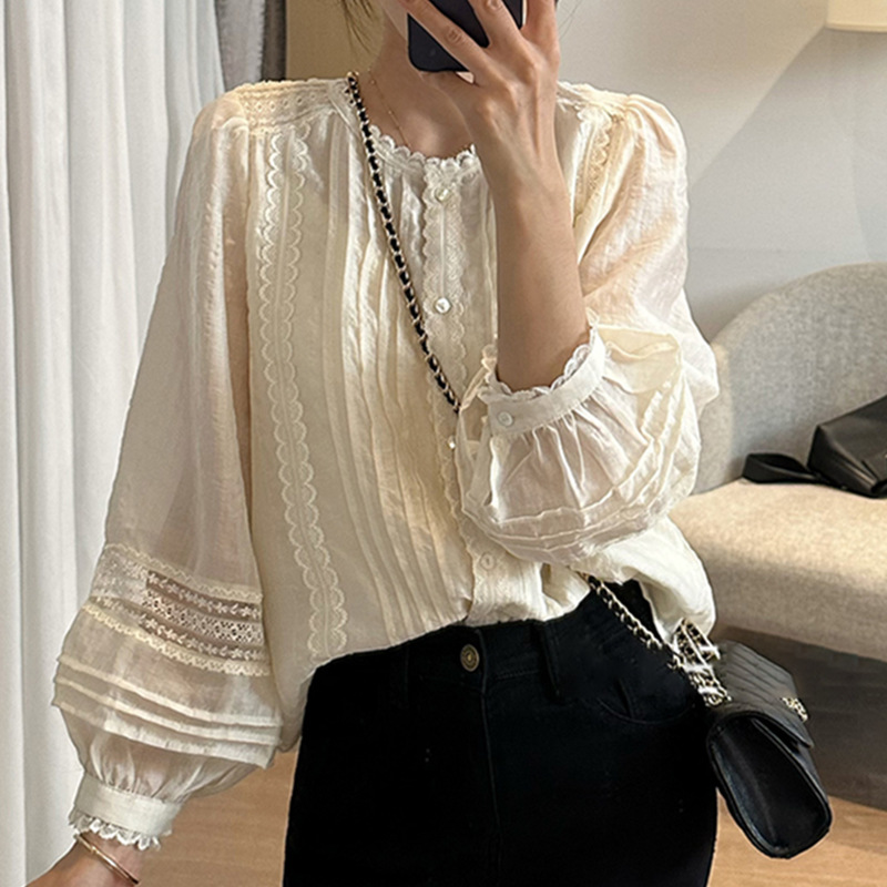 長袖のシャツの女性の春の服の新型の2024の爆発的な小さい子のシャツのフランス式の洋風は年齢を減らしてやせている気質の上着を現します。