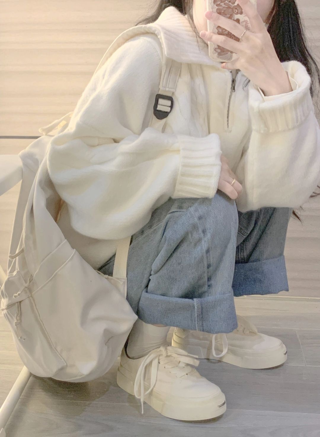 Polo襟の白いセーターの女性春と秋の2024の新型の爆発的な小柄な日系の怠惰な風の復古的な厚いコート