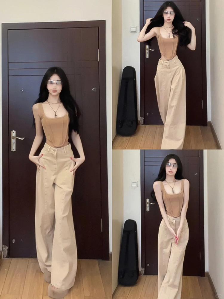 アメリカの高街のカーキ色の広脚ジーンズ女性夏の復古vibe高腰直筒がカジュアルなズボンを引きずっている