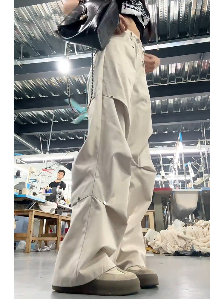 アメリカの高い街の柳の釘の杏色の広脚の工装のズボンの女性の夏の薄い金の復古のvibe風のしわのカジュアルなズボンの潮