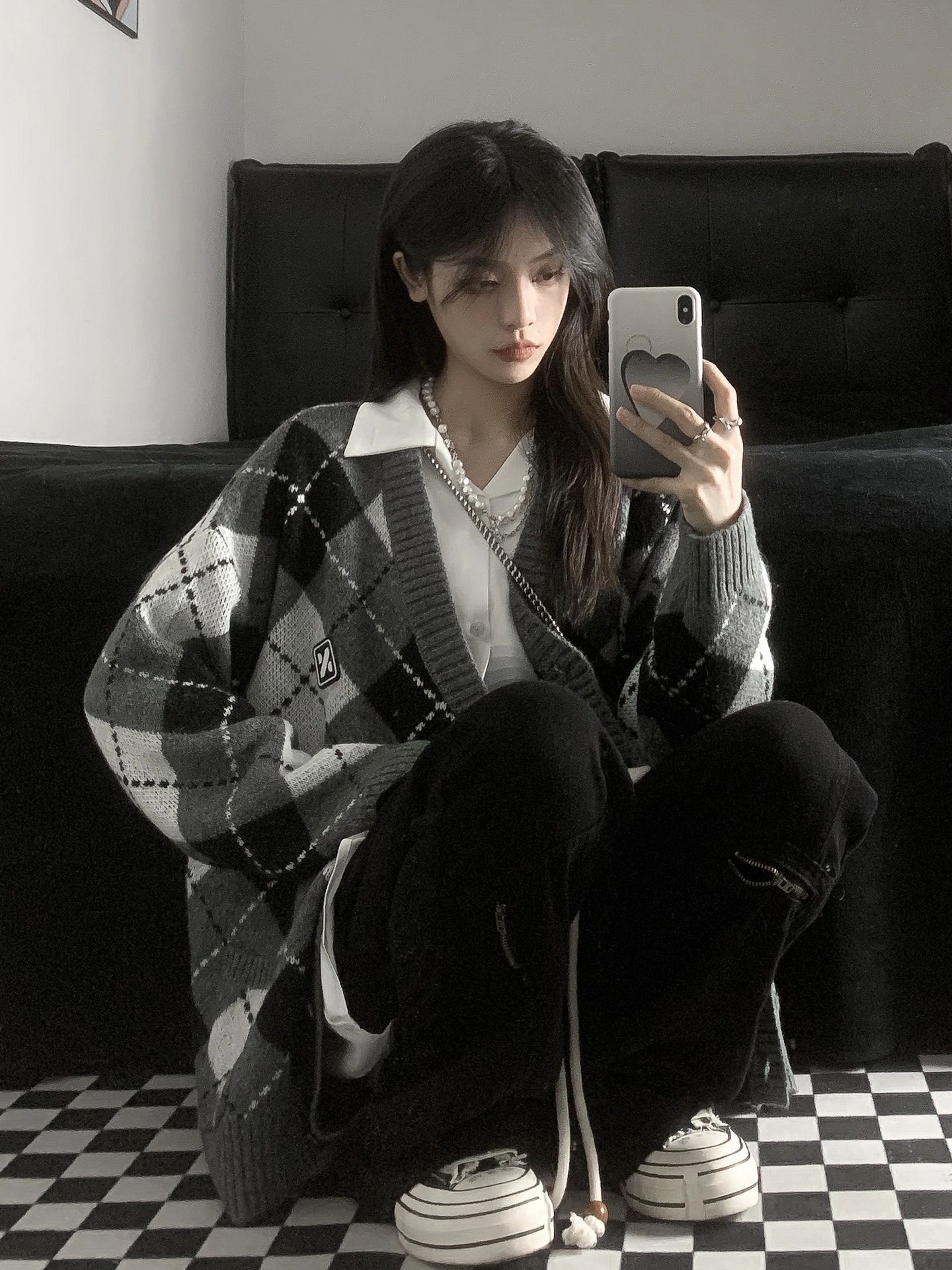 菱格のカーディガンのセーターの女性の春秋はゆったりしていて、優しいです。
