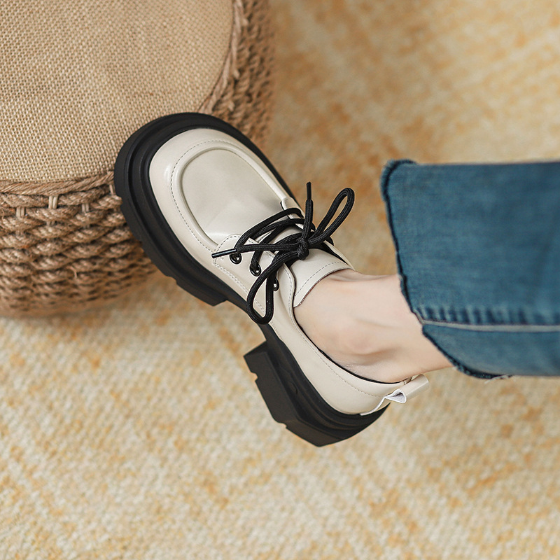 本革の白い厚い底の丸い靴の女性の2024の新型の英倫風の春秋のハイヒールのひもの楽福の靴