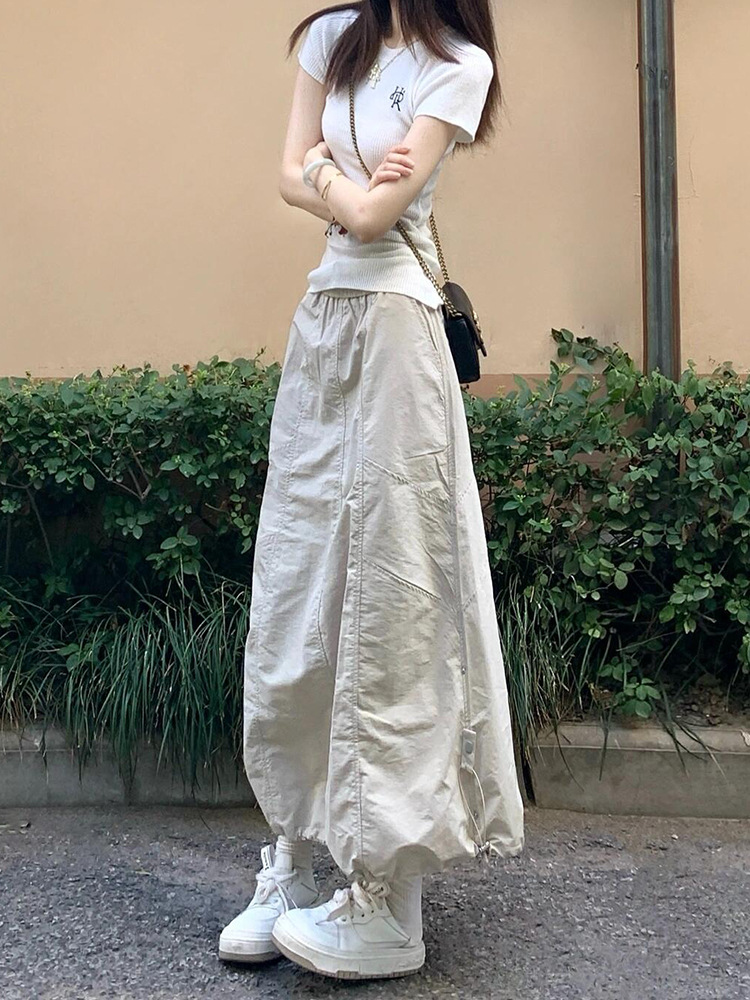 アメリカのレトロな米の白いひもの工装のスカートの女性の夏のゆったりしているハイウエストのA字のつぼみのスカートの蓬の半身のスカート