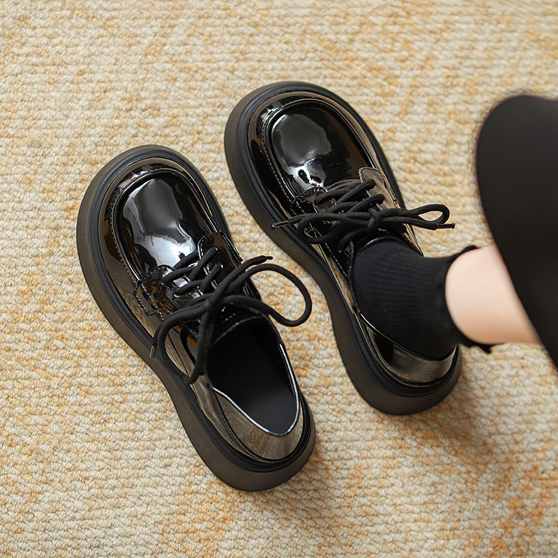 黒い厚い底の小さい靴の女性の2024新型の英倫風の春と秋にスカートの爆発的な靴のひもの楽福の靴を配合します。