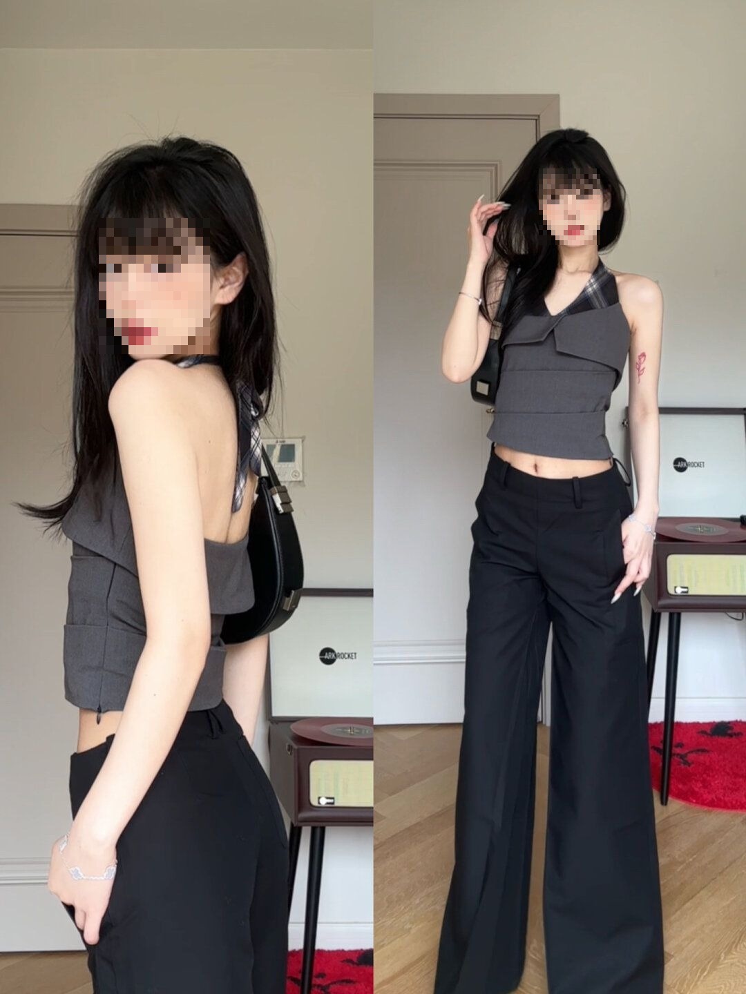 グレーの不規則な格子縞の首のストラップのベストの女性の夏のデザイン感の小さい大衆の高級感の非対称な上着の潮