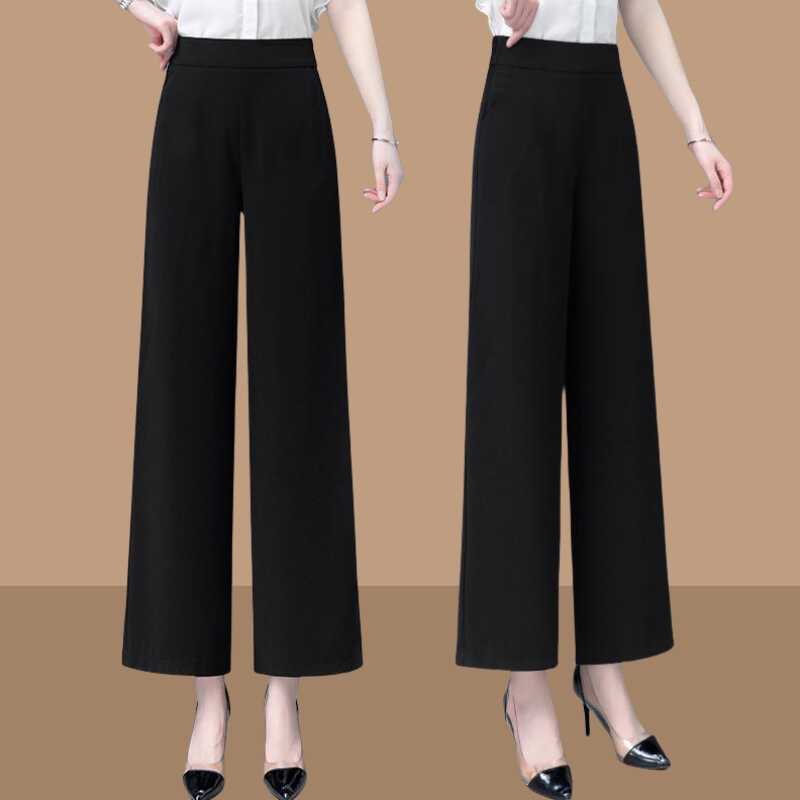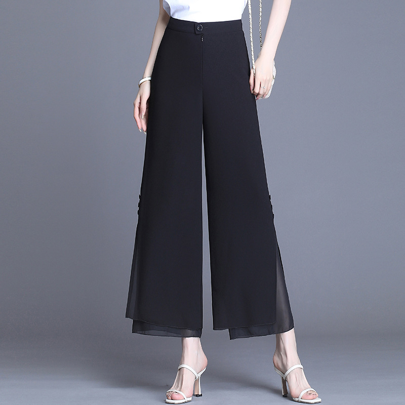 女性用シフォンワイドレッグパンツ、夏用薄手スリットブラックスリムパンツ、ゆったりストレート9点パンツ